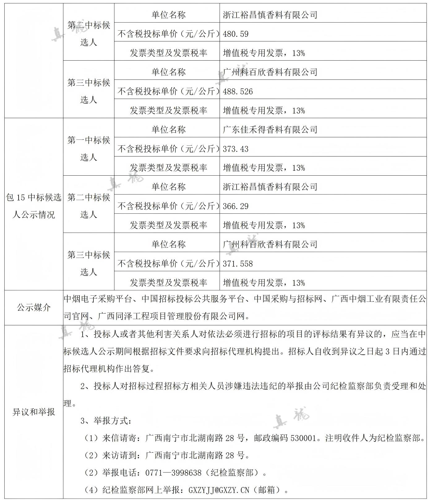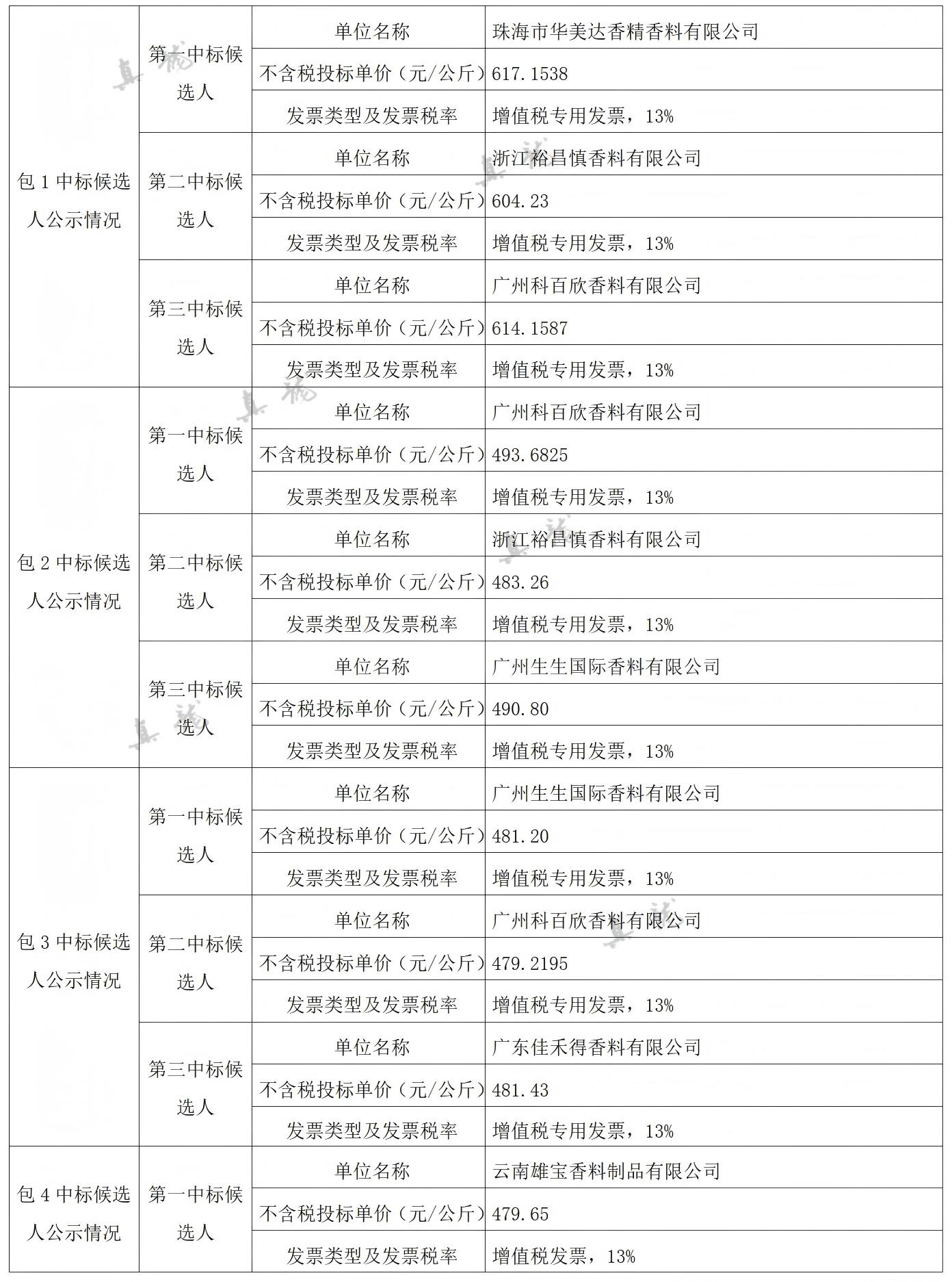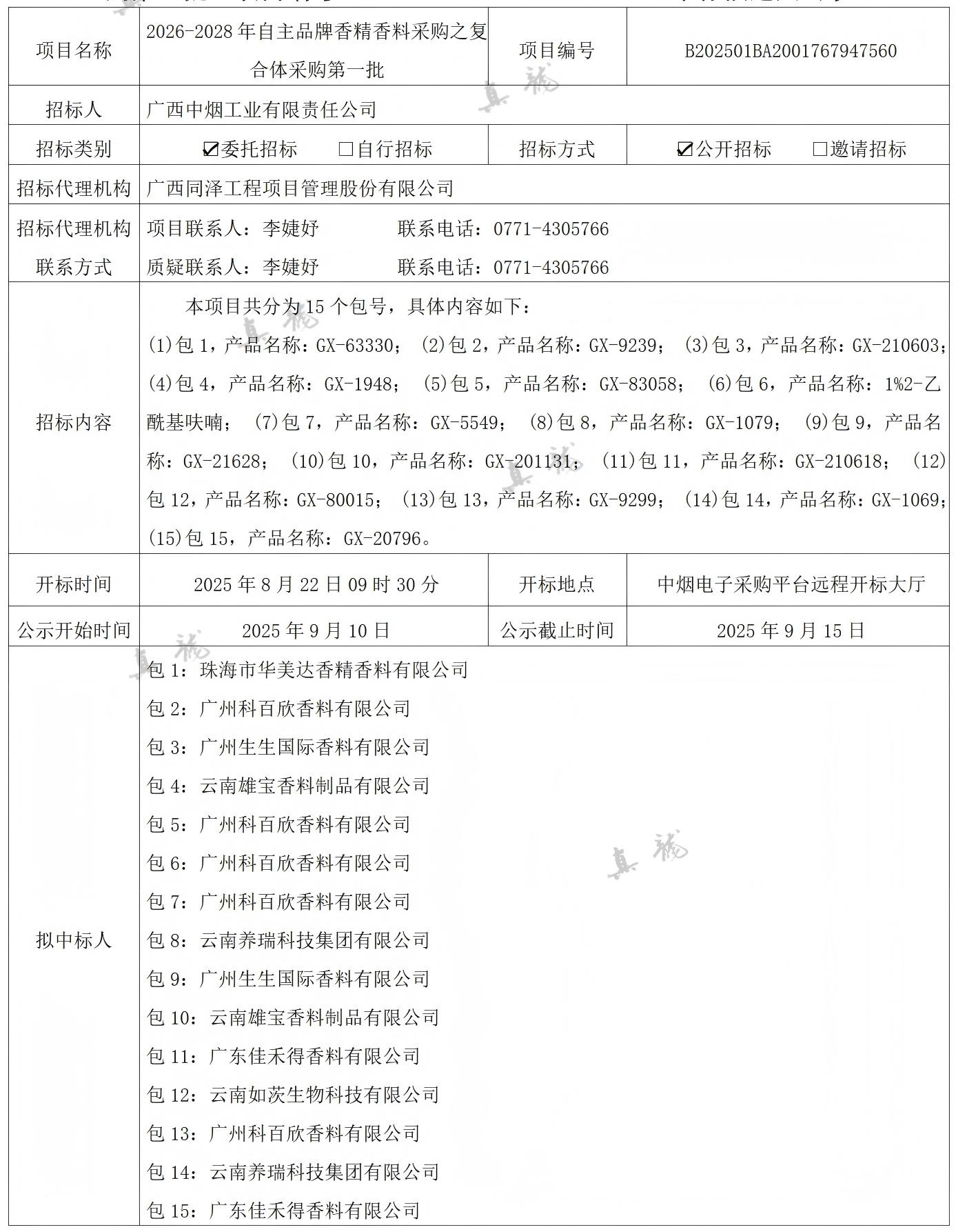 廣西中煙工業有限責任公司2026-2028年自主品牌香精香料采購之復合體采購第一批(項目編號:B202501BA2001767947560)中標候選人公示